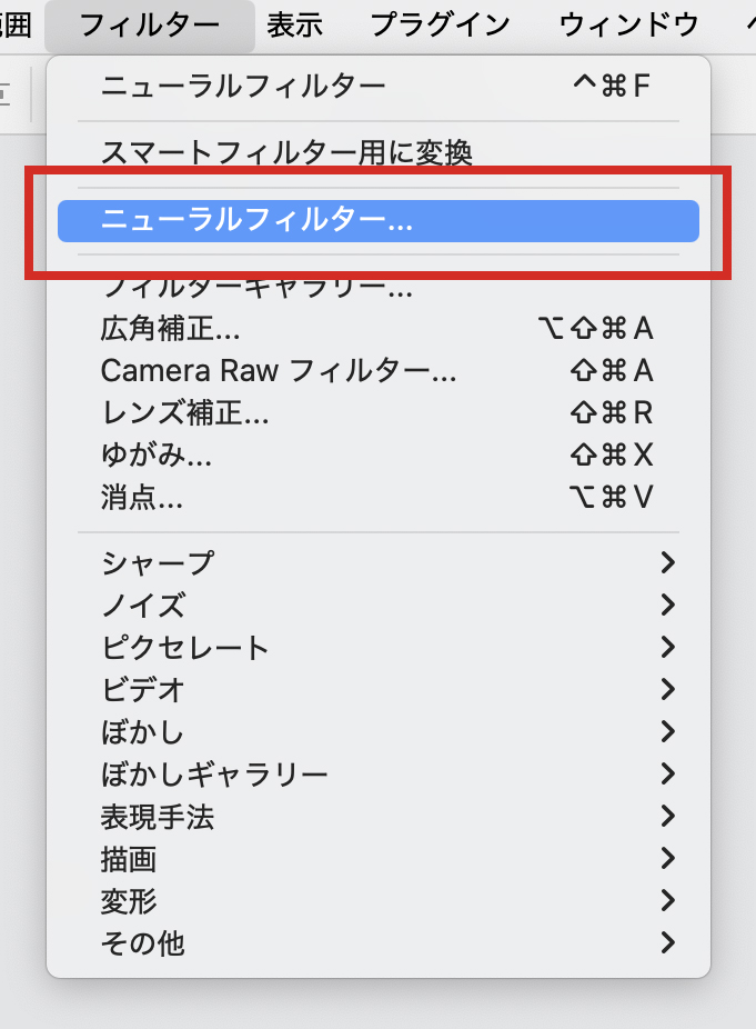 まず、Photoshopのフィルターメニューからニューラルフィルターを選択します。