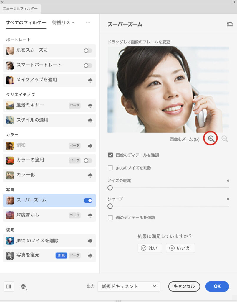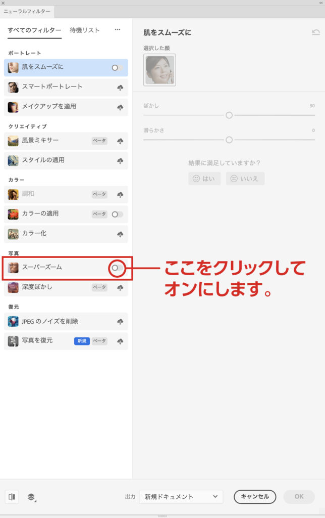 ニューラルフィルターのウインドウが現れるので、スーパーズームのところのスイッチをクリックしてオンにします。