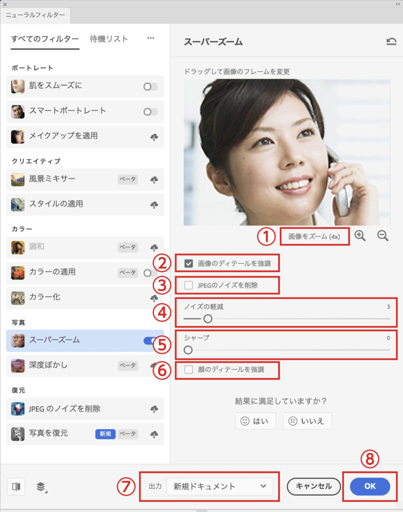 Photoshopのスーパーズームは、AI(人工知能)を活用して画像の劣化を抑えながら、最大16倍まで高画質で拡大できる機能です。